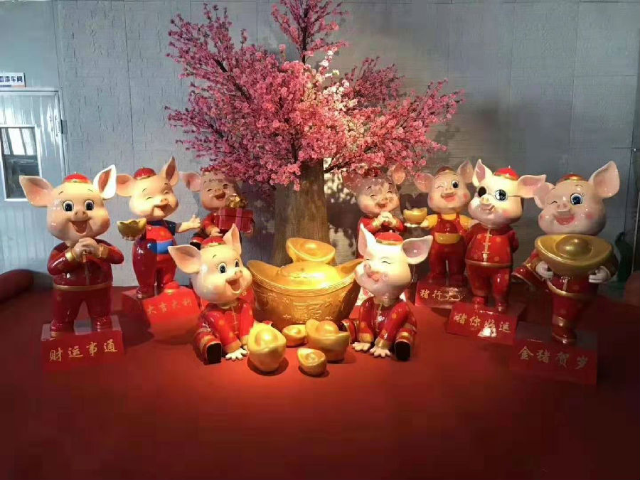 新年美陳講究喜慶吉祥,豬年就多體現豬的元素,吉祥豬能給人以帶來吉祥,財運,健康的象征!大紅色是新年美陳的主打色彩,中國人講究紅紅火火!